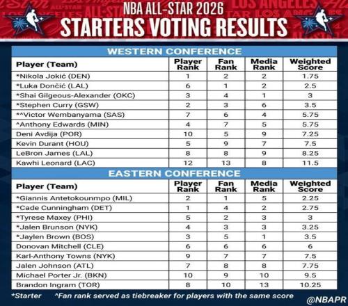没有詹姆斯!!西部全明星首发公布:库里+约基奇+SGA+东契奇+文班!